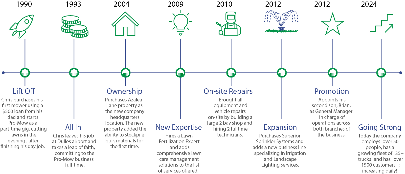 In 1990 Chris Gepford was a young married man with 2 young sons, Robert and Brian. He had a good job at Dulles airport but wanted to make some additional income for his young family. He talked with his dad, and he was supportive of Chris getting into the mowing business and offered a $500 loan to buy a top-of-the-line mower. Pro-Mow, Inc. was born right then and there.